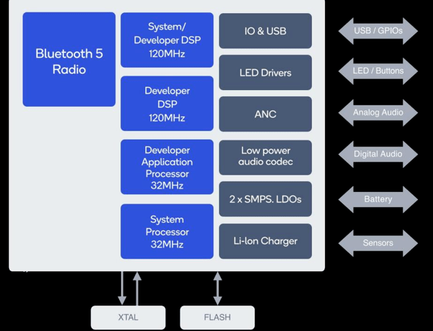 Системата върху чипа (SoC) на Qualcomm QCC5124 е проектирана да отговори на нуждите на малки устройства за стабилно, висококачествено, безжично Bluetooth слушане с ниска консумация на енергия за по-дълго аудио възпроизвеждане. Архитектурата QCC5124 е проектирана за висока производителност с ниска консумация на енергия. В сравнение с предишната си технология, консумацията на енергия може да бъде намалена с до 65 процента, позволявайки по-дълго аудио възпроизвеждане в почти всички режими на работа.