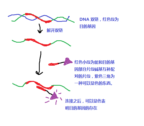 При подходящо рН, температура и йонна сила, ДНК сондата може да създаде водородна връзка с комплементарната небелязана едноверижна ДНК или РНК в пробата, която ще се тества, като използва високата точност на молекулярна денатурация, ренатурация и базово комплементарно сдвояване. се комбинират, за да образуват двуверижен комплекс.